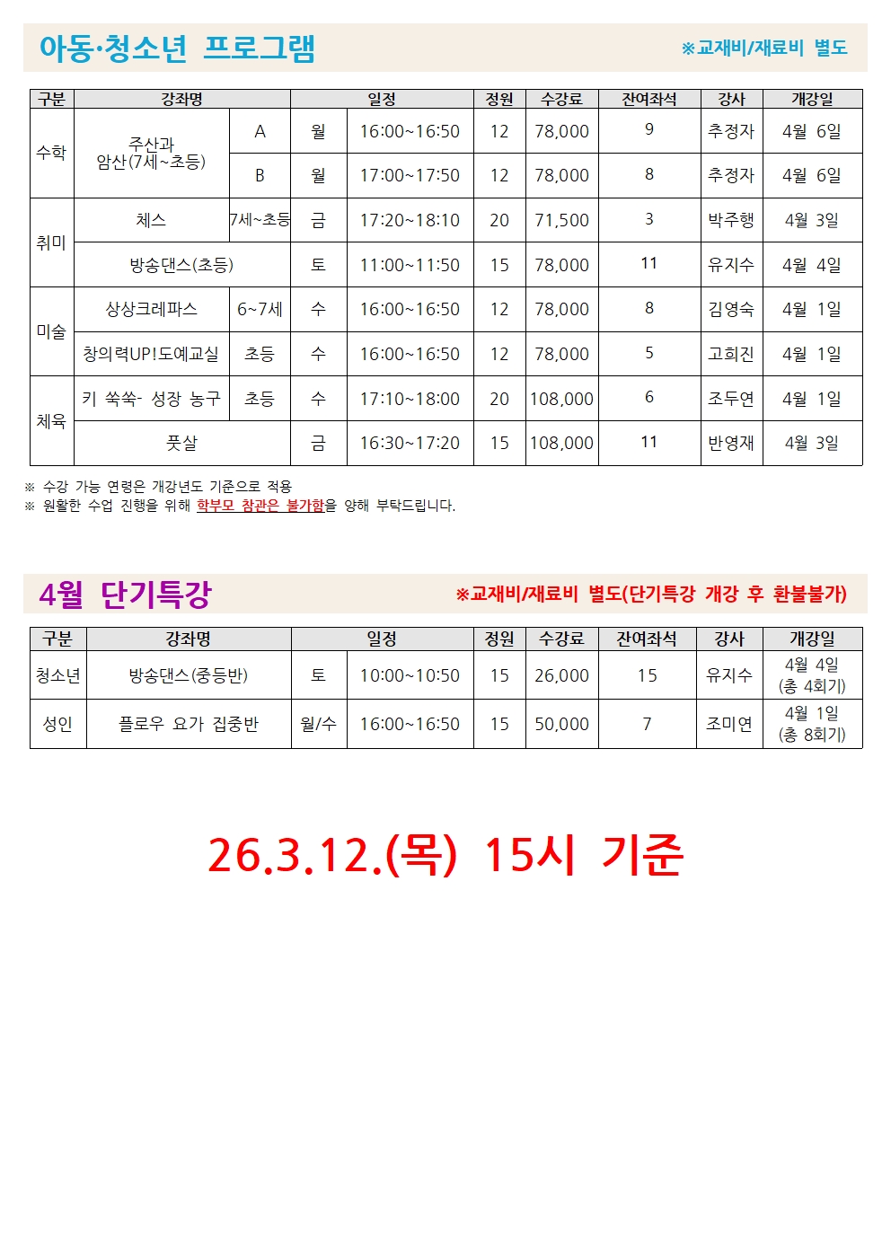 | 제목 | 2026년 2분기 평생교육 프로그램 접수 현황(3월 12일 15시 00분 기준) | ||
