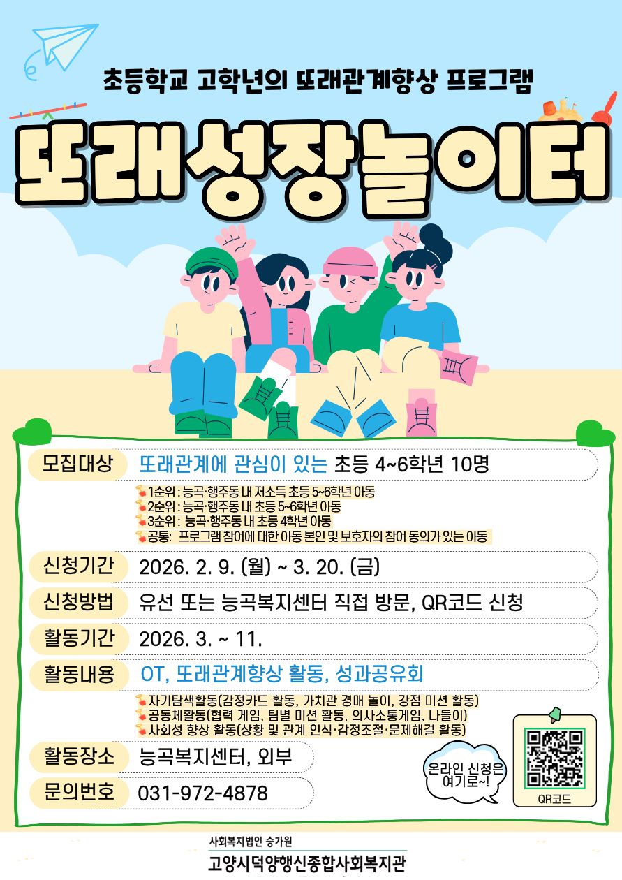 • 초등학교 고학년 대상 공동체 놀이 활동을 통한 또래관계향상 프로그램 '또래성장 놀이터' 참여아동, 자원봉사자 모집