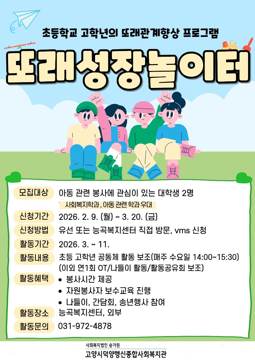 제목 초등학교 고학년 대상 공동체 놀이 활동을 통한 또래관계향상 프로그램 '또래성장 놀이터' 참여아동, 자원봉사자 모집