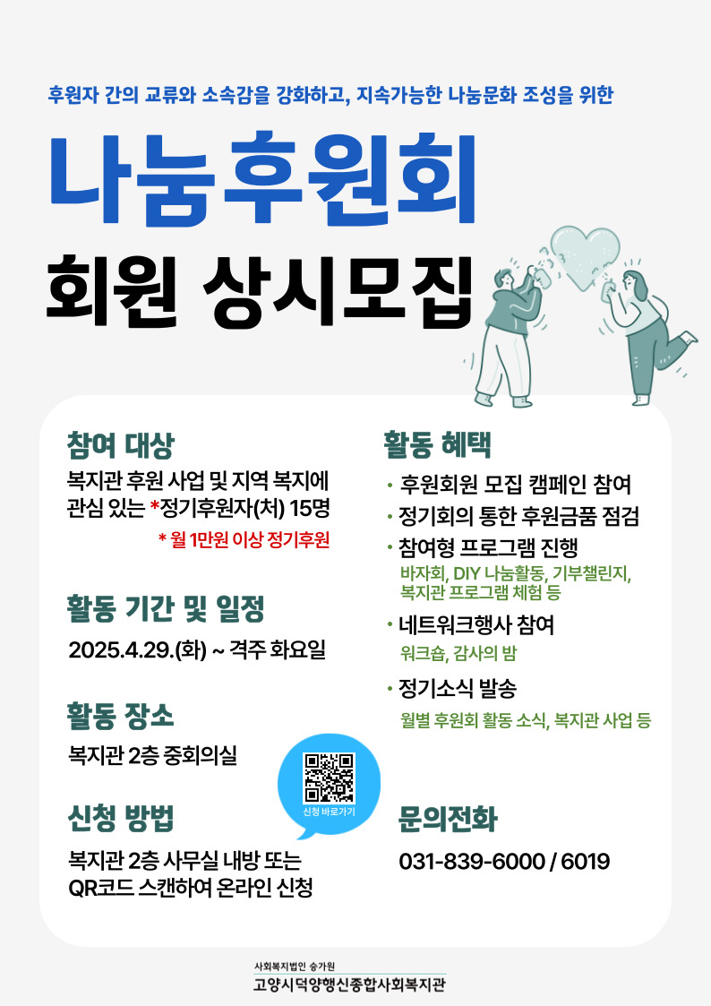나눔후원회는 후원자 간의 교류와 소속감을 강화하고, 지속가능한 나눔문화 조성을 위해 진행됩니다. 이에 우리 복지관에 많은 관심과 사랑으로 후원에 참여하고 계시는 정기후원자(월 1만원 이상 정기후원)를 대상으로 모집합니다.