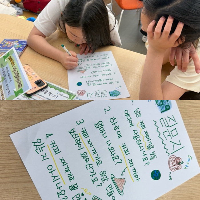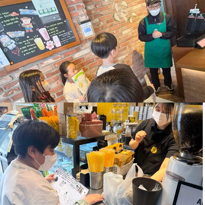 아이들은 카페 사장님께 커피 찌꺼기 나눔을 요청하고, 키링 제작 계획을 소개했습니다. 또한 처리 방법, 재활용 경험, 텀블러 사용 여부 등을 직접 질문하며 지역사회의 환경 인식과 분위기를 알아보는 시간을 가졌습니다.