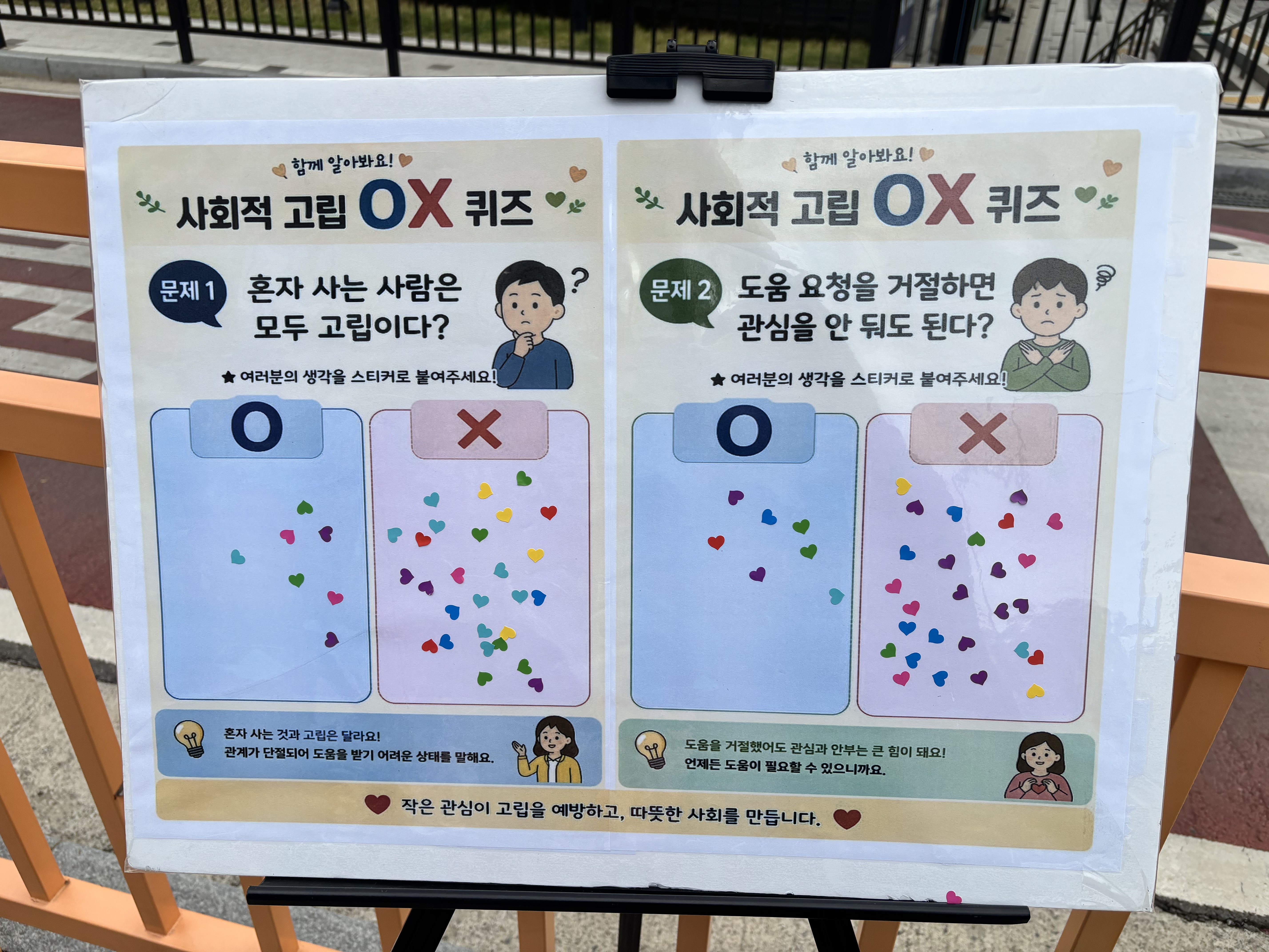짧은 만남이었지만 고립가구를 알리고, 이웃을 돌아보는 마음이 조금씩 퍼지는 시간이 되었습니다. 앞으로도 캠페인을 통해 고립가구에 대한 인식을 개선하고, 어려운 이웃을 함께 돌볼 수 있는 활동이 될 수 있도록 노력하겠습니다. 많은 기대 부탁드립니다! [문의: 지역3과 나윤경 사회복지사 031-839-6085]