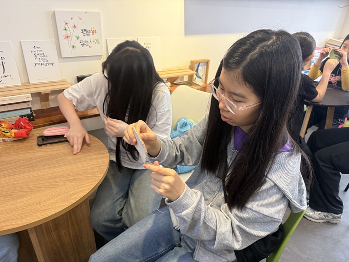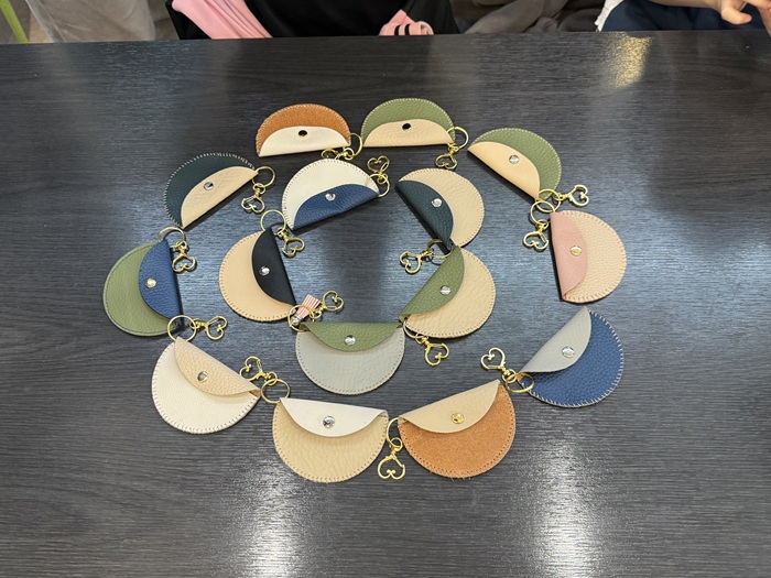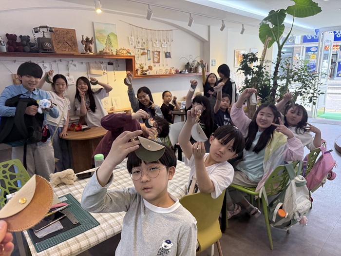 아이들은 가죽을 자르고 바느질하고 고리를 다는 과정을 하나하나 따라가며 점점 자신만의 작품을 완성해 나갔습니다. 처음에는 서툴렀지만 금세 집중하는 모습이 인상적이었는데요. “선생님, 제가 만든 거 진짜 예쁘죠?” “이거 엄마한테 선물로 드릴 거예요!” 아이들은 완성된 동전지갑을 들고 서로 자랑하며 환하게 웃었습니다.
