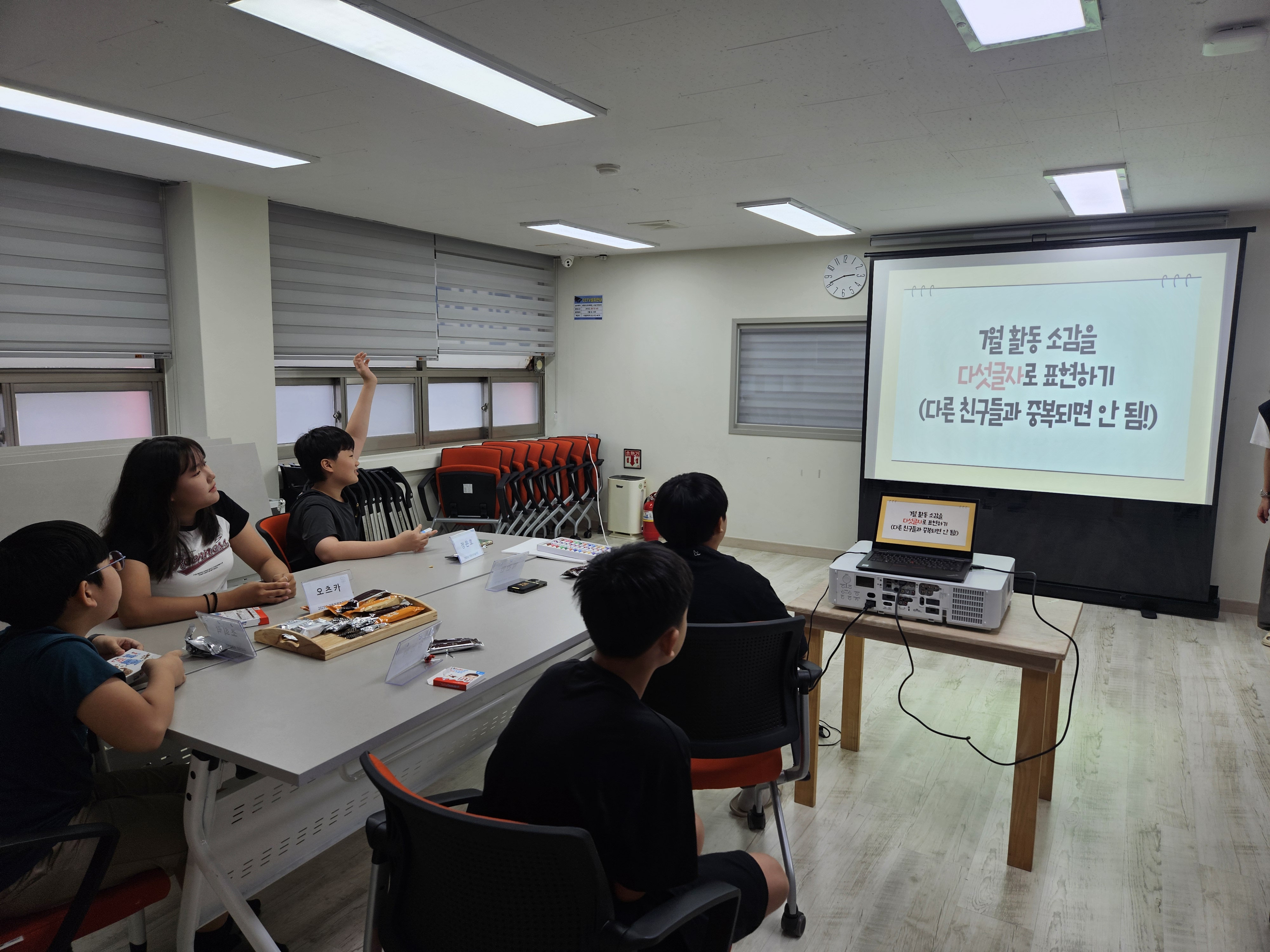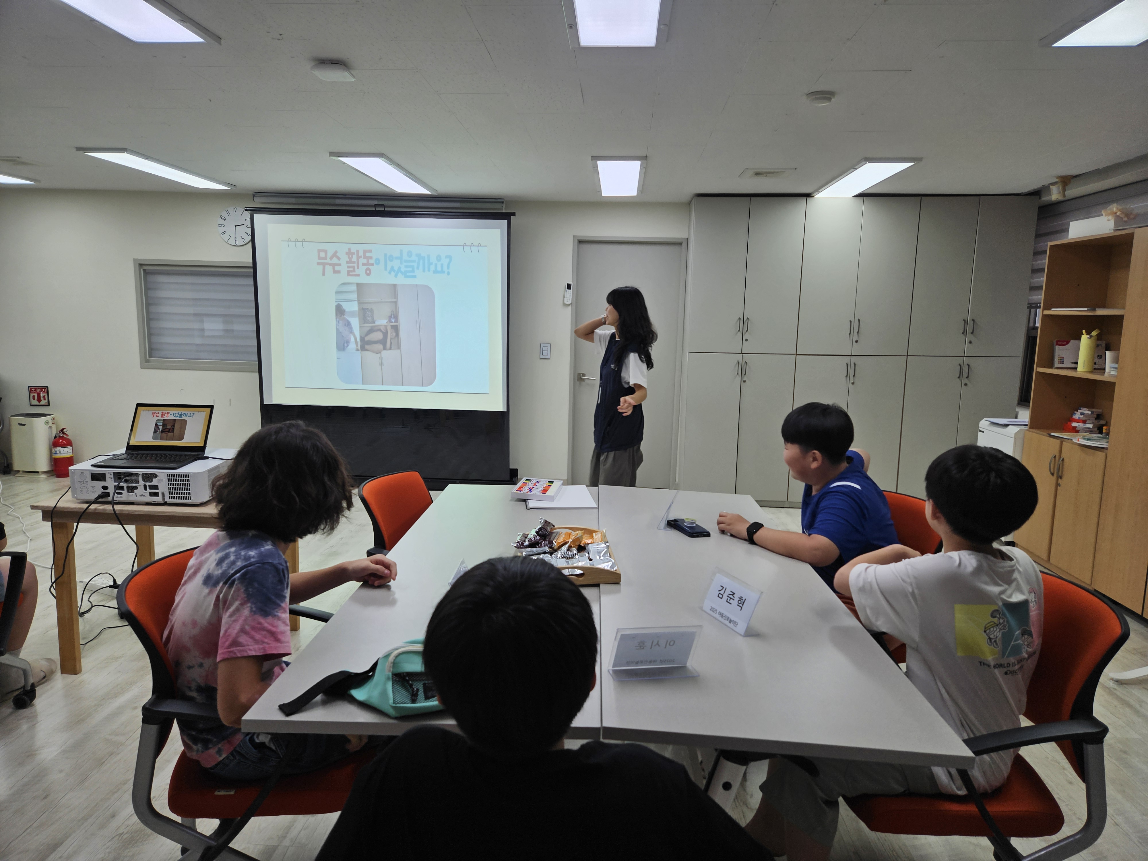다음으로 7월 진행했던 활동에 대해 함께 소감을 나눠보는 시간을 가졌는데요~ 확대된 사진을 보고, 어떤 활동이었는지 맞히는 게임을 진행하며 즐겁게 소감을 나눠보았습니다. "저는 좀비게임하면 다른 친구랑 조금 더 친해진 거 같아요." "드럼체험 재미있었어요. 다음에도 또 하고 싶어요!" "디지털장의사 직업을 처음 알게 되었는데, 좀 흥미롭고 신기했어요."