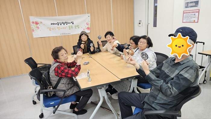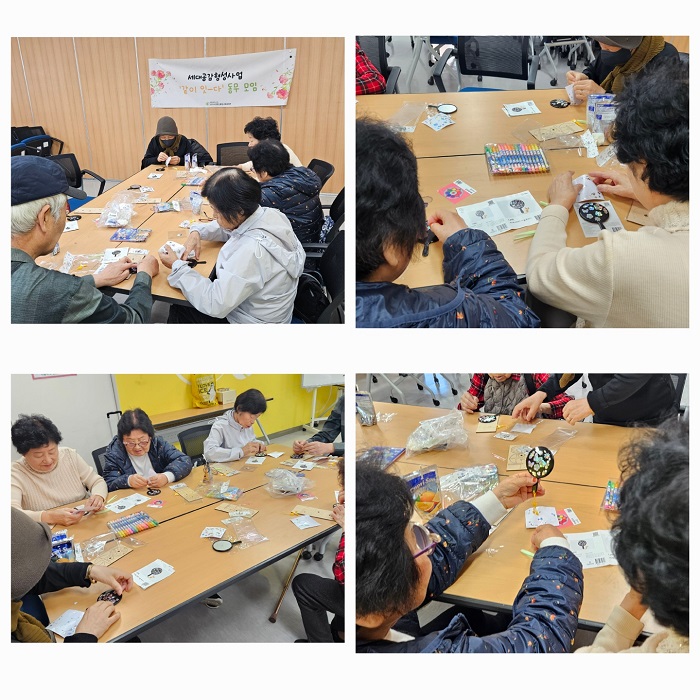 안녕하세요! 가을 날씨에서 겨울 날씨로 서서히 변해가고 있습니다! 주민 여러분은 건강 관리 잘 하고 계신가요? 2024.10.30.(수) 세대공감형성사업 '같이 잇-다'에서는 어르신 모임인 동무모임 4회기를 진행했습니다. 어르신들끼리 모이는 활동은 매우 오랜만인데요. 어르신들간의 반가운 인사로 이번 시간을 열었습니다! 활동 주제는 '나무 팽이 만들기', '자개 손거울 꾸미기'를 진행했습니다! 먼저, 더 간단하게 만들 수 있는 '자개 손거울 꾸미기'를 진행했는데요. 어르신들이 모두 쉽게 따라하며 각자 취향에 맞게 손거울을 꾸몄습니다.