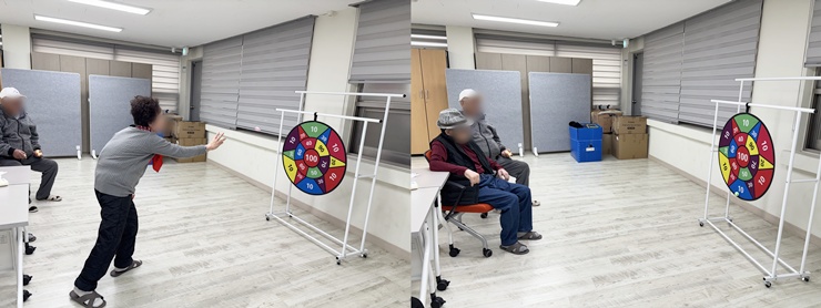 다트 게임을 진행하며 주민분들은 "나도 100점 한 번 맞춰보고 싶은데 나만 못 맞추네. 한 번 더 해봐도 돼요?", "나는 던질 때마다 100점이네~ 내가 게임을 제일 잘하는 것 같아!" 와 같은 의견을 말씀해주셨습니다 :)