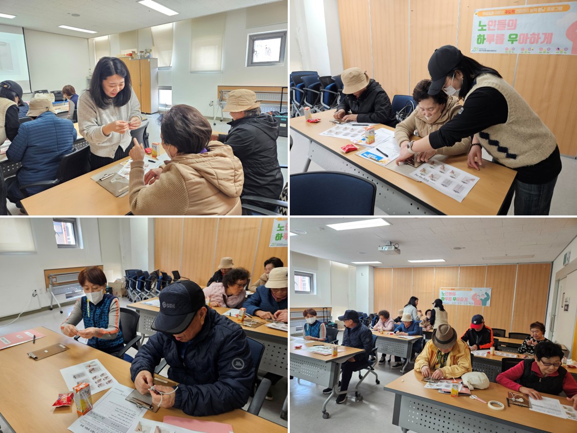 처음에는 “이거 너무 어려운 거 아니야?” 하시며 조심스럽게 시작하시던 어르신들 ? 하지만 하나씩 따라 하시다 보니 점점 손에 익어가고, 어느새 옆에 앉은 어르신께 방법을 알려주시기도 했습니다.